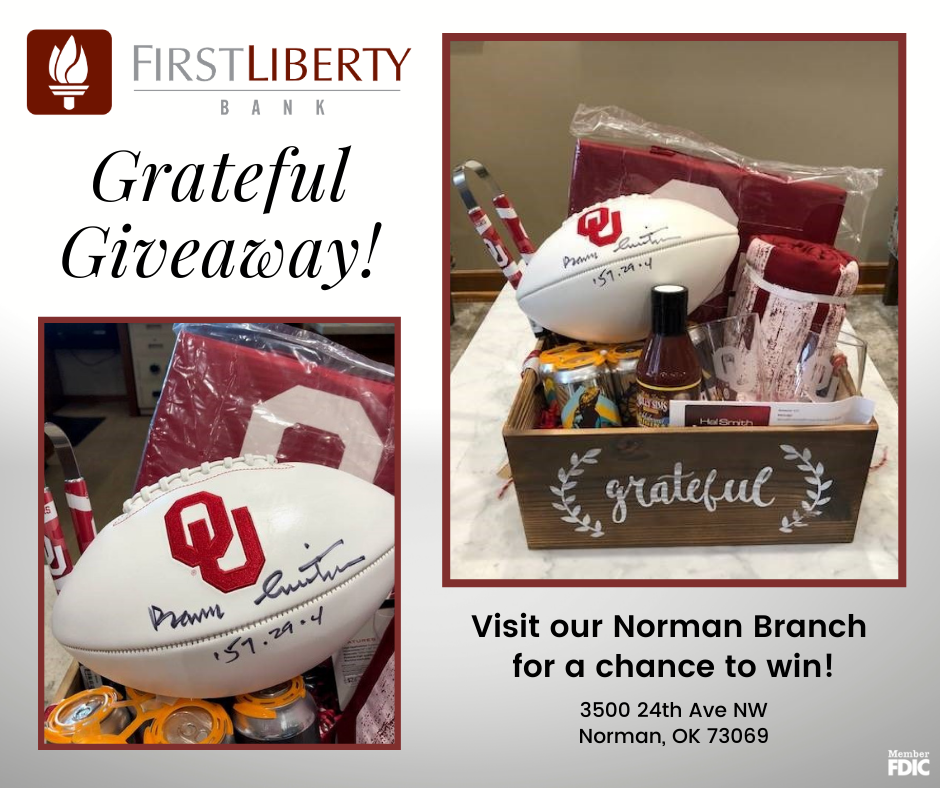 Visit our Norman Branch during regular business hours from October 21st until Tuesday, November 17th. You don’t even have to get out of your car! Just pull up in our drive-thru and let us know you want to enter your name for a chance to win our Grateful Giveaway Basket. Many thanks to Coach Barry Switzer for the signed football! The rest of the goodies came from local businesses including Balfour, Black Mesa Brewing, and Hal Smith Restaurants. The giveaway ends Tuesday, November 17th at 5:30 CST. On Wednesday, November 18th, First Liberty Bank will select the winner, contact the winner directly, and make an announcement on our Facebook page. Good luck!